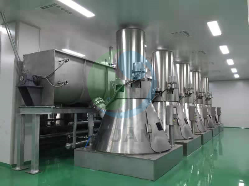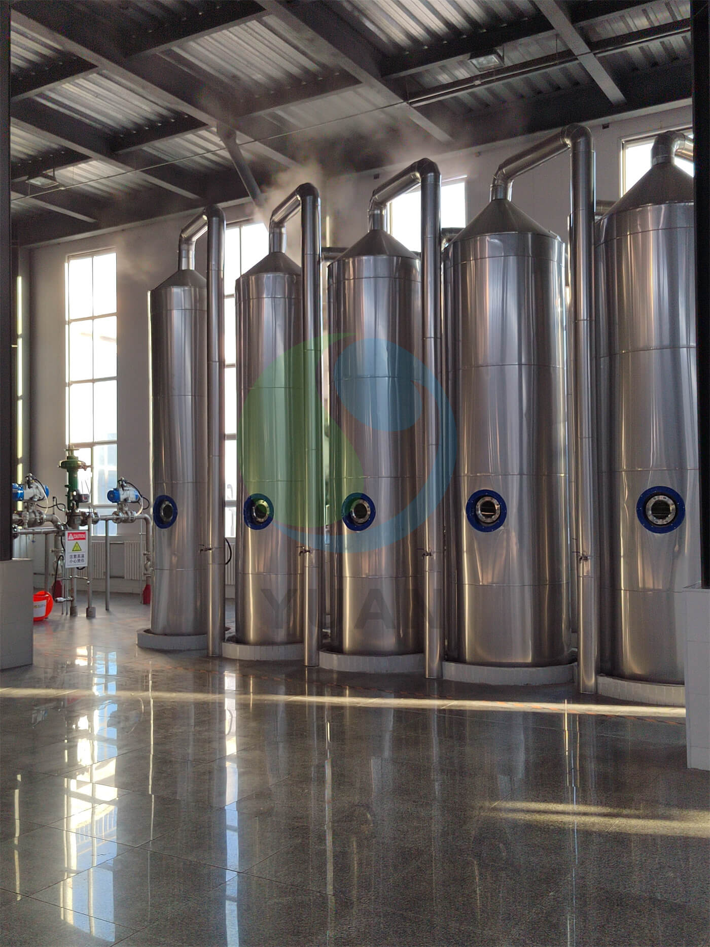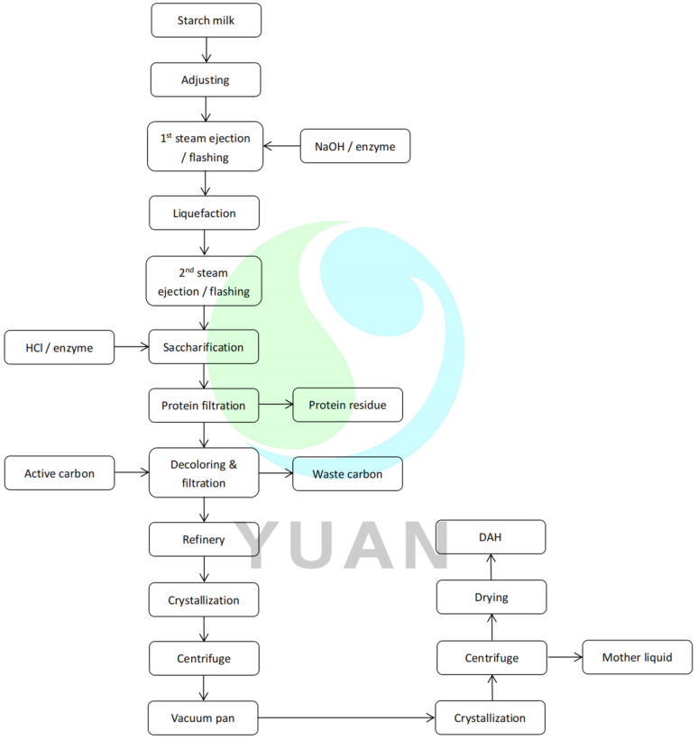 O amido comercial é enviado ao tanque de dissolução e dissolvido adicionando água. Em seguida, entra no tanque de mistura de pasta, através de detecção e controle on -line, ajuste o DS, o valor do pH e a quantidade de enzima do leite de amido e, em seguida, entra no sistema de liquefação automática. Adote duas vezes ejeção, piscando duas vezes, mantenha a temperatura apropriada. e um certo tempo, para garantir o melhor efeito de liquefação. Após a liquefação, através do ajuste do pH e adição de enzimas, o xarope é enviado ao sistema de sacarificação. Ao controlar a quantidade de tempo de enzima e sacarificação, o valor DE ou DX exigido pelo produto final é atingido e o xarope entra no estágio de filtração para remover a menor proteína e outras impurezas misturadas no produto. Após a filtração, o xarope líquido passa por descoloria, filtragem e sistema de troca de íons contínuo para remover as impurezas coloridas e os íons de impureza do xarope, para que o xarope possa alcançar o objetivo de refinar e purificação. Após a concentração através do evaporador, a glicose atinge a concentração necessária para a cristalização e entra no sistema de cristalização. De acordo com a curva de resfriamento do sistema de cristalização, a temperatura da glicose no cristalizador é ajustada automaticamente. Depois de manter por um certo tempo, o cristal entra na centrífuga para separação. Após a separação, o licor mãe é ainda mais usado ao retornar ao processo anterior. A glicose separada é dissolvida adicionando água na panela a vácuo de DAH para evaporação e cristalização. Em seguida, o massecuíto após a panela de vácuo é enviado ao cristalizador e separado pela centrífuga mais suspensa. O cristal de glicose anidro separado é enviado ao secador para a secagem para obter produtos DAH qualificados.