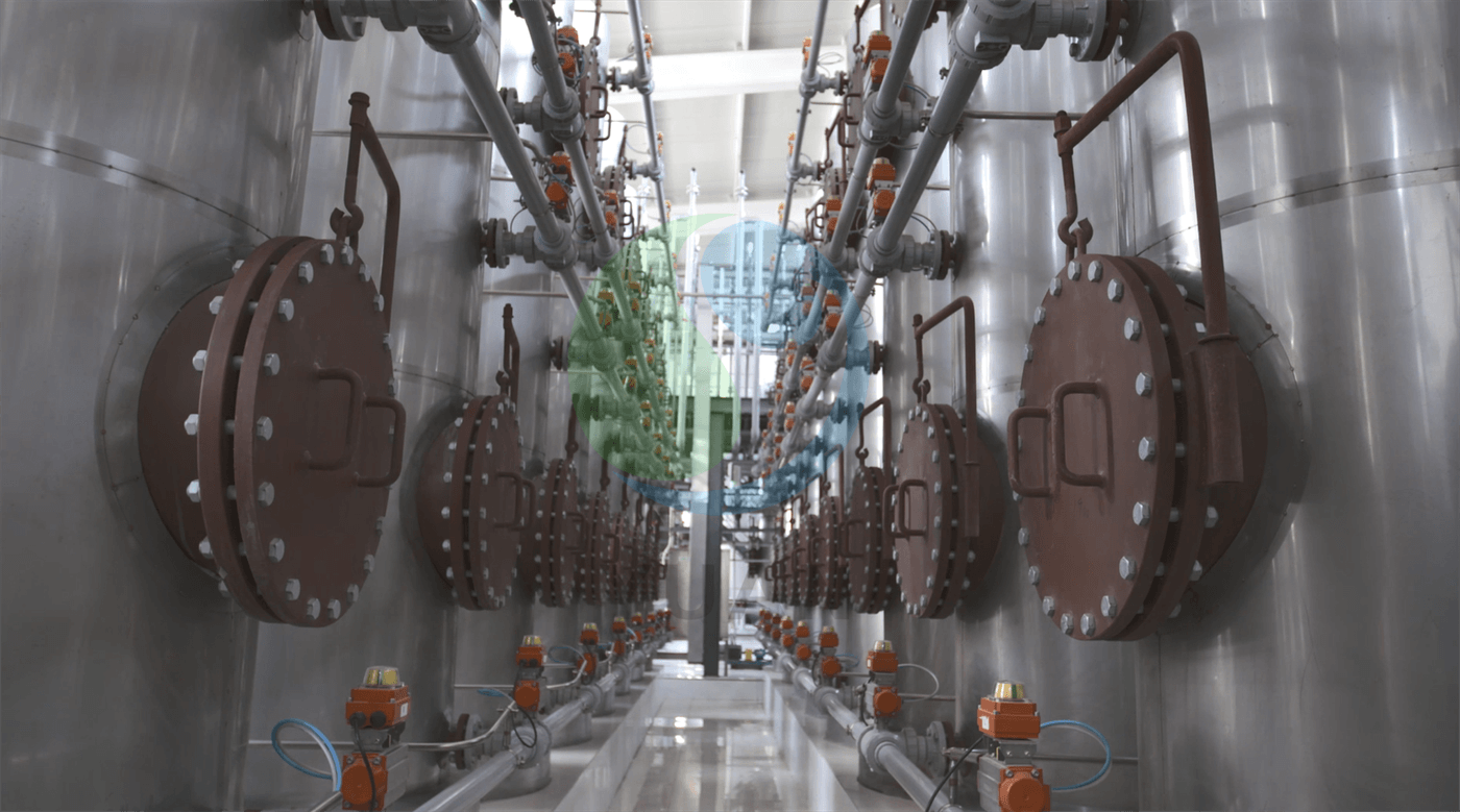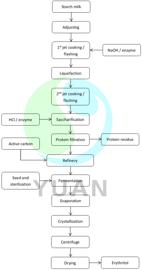 O amido comercial é enviado ao tanque de dissolução e dissolvido adicionando água. Em seguida, entra no tanque de mistura de pasta, através de detecção e controle on -line, ajuste o DS, o valor do pH e a quantidade de enzima do leite de amido e, em seguida, entra no sistema de liquefação automática. Adote duas vezes ejeção, piscando duas vezes, mantenha a temperatura apropriada. e um certo tempo, para garantir o melhor efeito de liquefação. Após a liquefação, através do ajuste do pH e adição de enzimas, o xarope é enviado ao sistema de sacarificação. Ao controlar a quantidade de tempo de enzima e sacarificação, o valor DE ou DX exigido pelo produto final é atingido e a glicose entra no estágio de filtração para remover a menor proteína e outras impurezas misturadas no produto. Após a filtração, a glicose líquida passa por descoloria, filtragem e sistema de troca de íons contínuos para remover as impurezas coloridas e os íons de impureza da glicose, para que a glicose possa alcançar o objetivo de refinar e purificação. A glicose refinada entra no sistema de fermentação com a adição de tensão e sal nutritivo e mantém um certo tempo para a fermentação. O mash fermentado é concentrado pelo sistema evaporador e entra no cristalizador para a cristalização. De acordo com a curva de resfriamento definida, mantenha um certo tempo, após a separação e secagem centrífuga, o produto de eritritol qualificado é obtido.