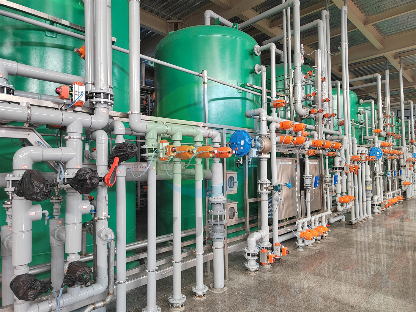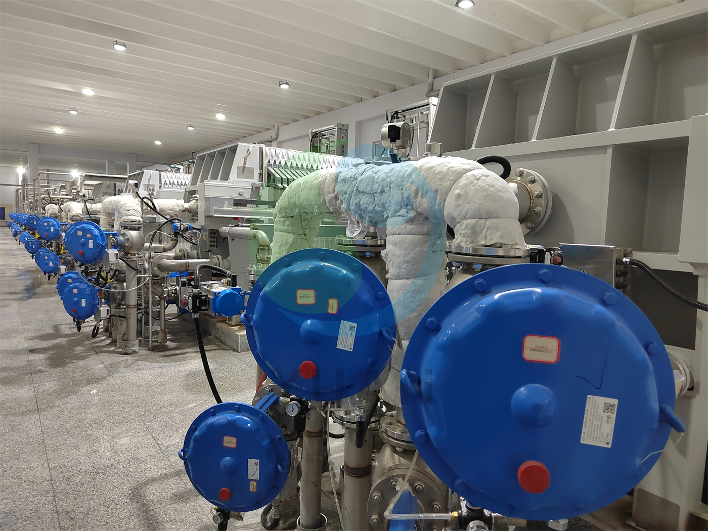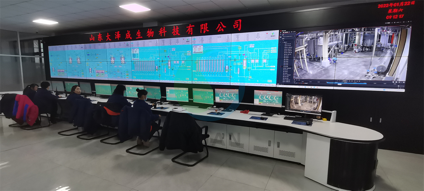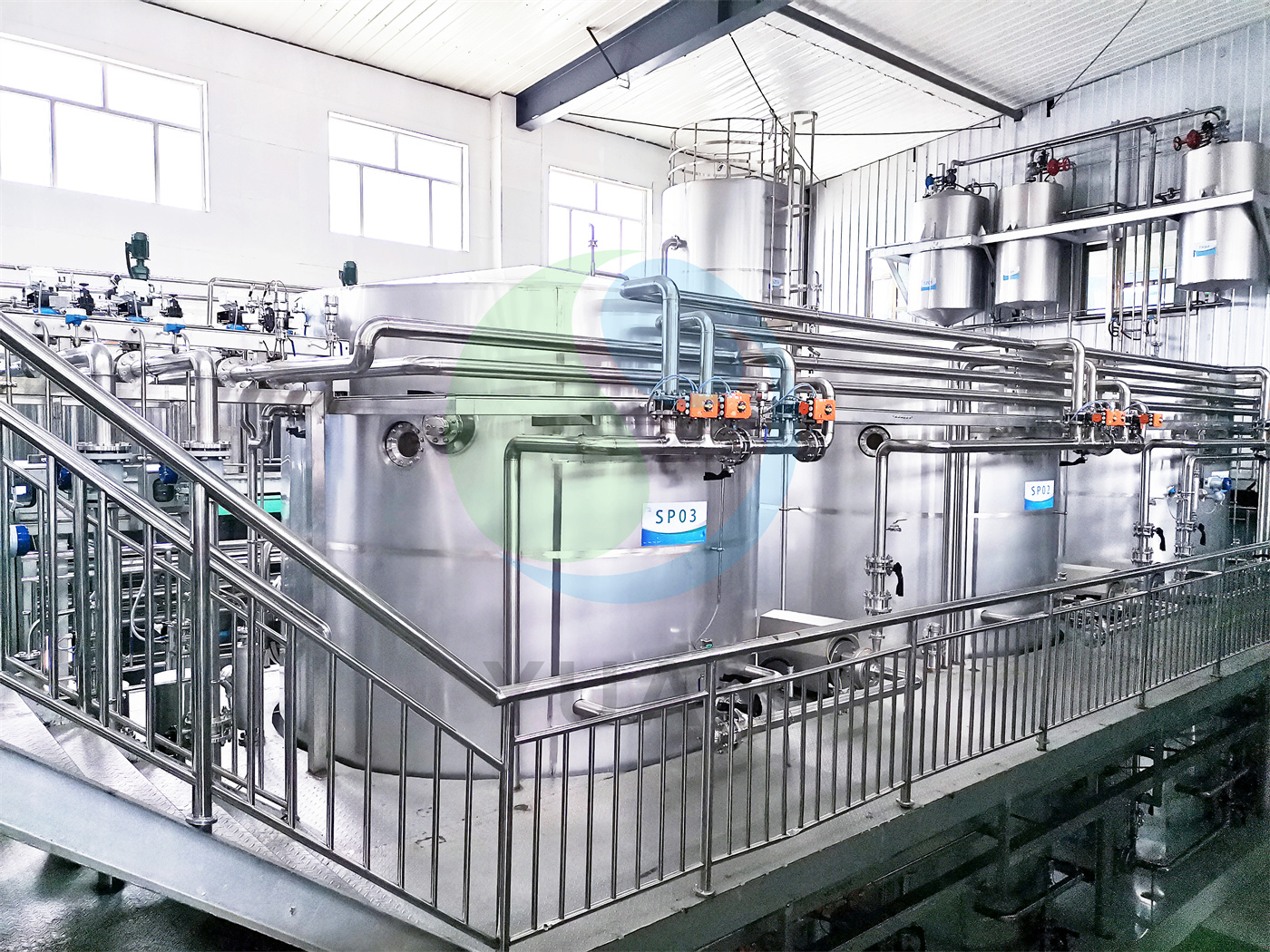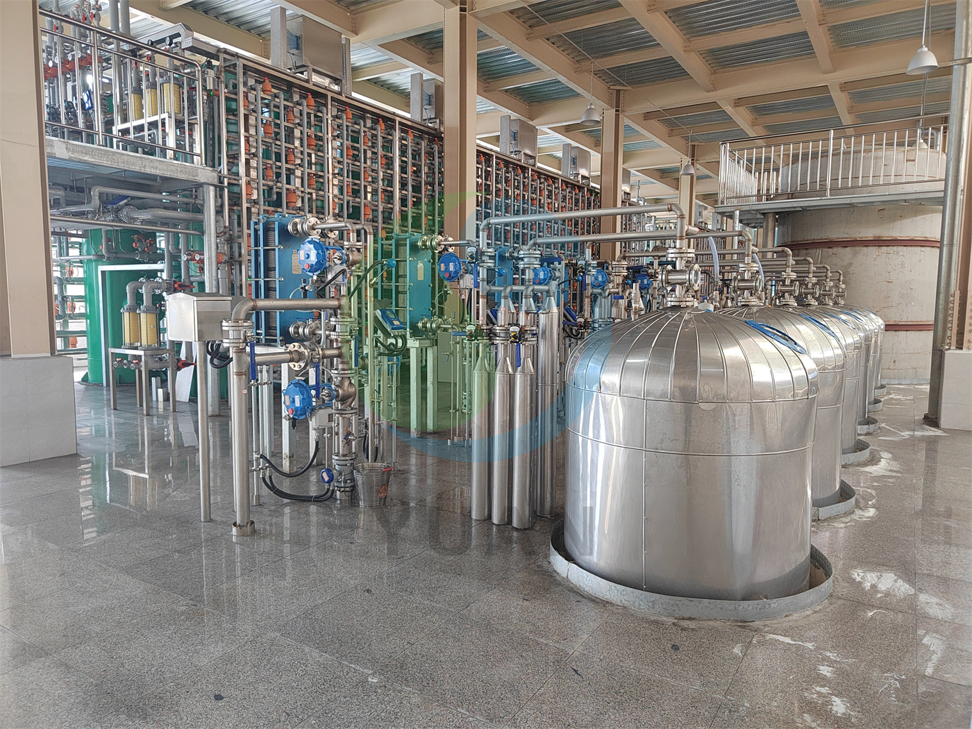 O amido comercial é enviado ao tanque de dissolução e dissolvido adicionando água. Em seguida, entra no tanque de mistura de pasta, através de detecção e controle on -line, ajuste o DS, o valor do pH e a quantidade de enzima do leite de amido e, em seguida, entra no sistema de liquefação automática. Adote duas vezes ejeção, piscando duas vezes, mantenha a temperatura apropriada. e um certo tempo, para garantir o melhor efeito de liquefação. Após a liquefação, através do ajuste do pH e adição de enzimas, o xarope é enviado ao sistema de sacarificação. Ao controlar a quantidade de tempo de enzima e sacarificação, o valor DE ou DX exigido pelo produto final é atingido e a glicose entra no estágio de filtração para remover a menor proteína e outras impurezas misturadas no produto. Após a filtração, a glicose líquida passa por descoloria, filtragem e sistema de troca de íons contínuos para remover as impurezas coloridas e os íons de impureza da glicose, para que a glicose possa alcançar o objetivo de refinar e purificação. Após a evaporação, a glicose entra no sistema de isomerização para obter a frutose 42%. Através da refinaria e evaporação, o F42 entra no sistema de cromatografia. O F90 produzido se mistura com F42 para obter o F55 grosso e, em seguida, através da refinaria e evaporação F55, o produto F55 qualificado será obtido.