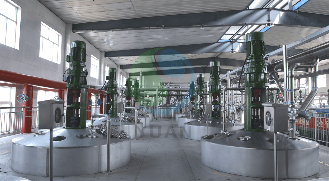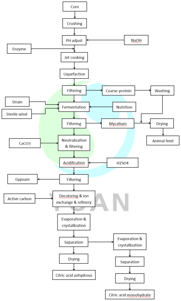 Depois que o milho é esmagado pelo caminho de moagem seca, a pasta de milho entra no sistema de ejeção e liquefação. Mantenha a temperatura e a liquefação por um determinado momento, ele entra na seção de filtração. Filtre a proteína bruta, após a esterilização, entra no sistema de fermentação. Mantenha a temperatura certa, certo tempo e oxigênio suficiente para a fermentação. Após a filtragem, o purê de fermentação entra na seção de neutralização da produção de ácido cítrico. Após a lavagem e recuperação do ácido cítrico, o resíduo bacteriano filtrado é misturado com a proteína bruta liquefeita para secar como alimentação animal. Na seção de neutralização, adota duas vezes neutralização e filtração, é obtida a precipitação de citrato de hidrogênio de cálcio. Após hidrólise e extração ácida, o ácido cítrico primário é obtido. Através da descoloração, filtração e sistema de troca de íons contínuos, as impurezas coloridas, o cheiro peculiar e outros íons de impureza do xarope são removidos, de modo a fazer o ácido cítrico alcançar o objetivo de refinar e purificação. Depois disso, ele entra no sistema de cristalização de evaporação a vácuo, após a separação centrífuga, secagem, o ácido cítrico qualificado é obtido. A licor mãe proveniente da centrífuga passa pelo sistema de evaporação e cristalização a vácuo, separação centrífuga e secagem, para obter o monohidrato de ácido cítrico qualificado como o produto final.
