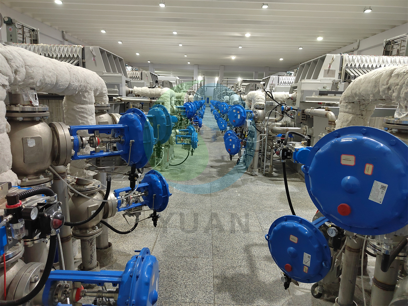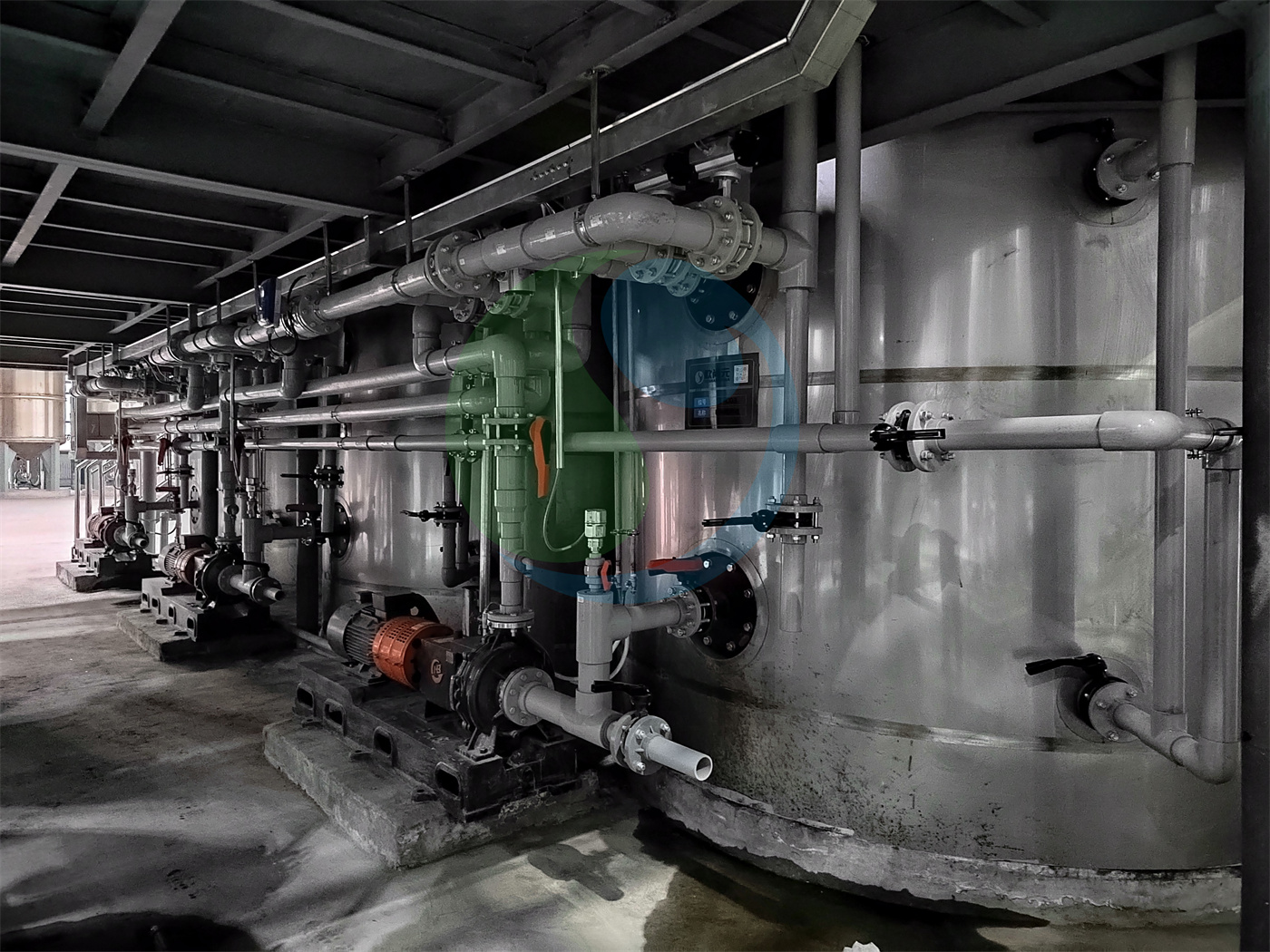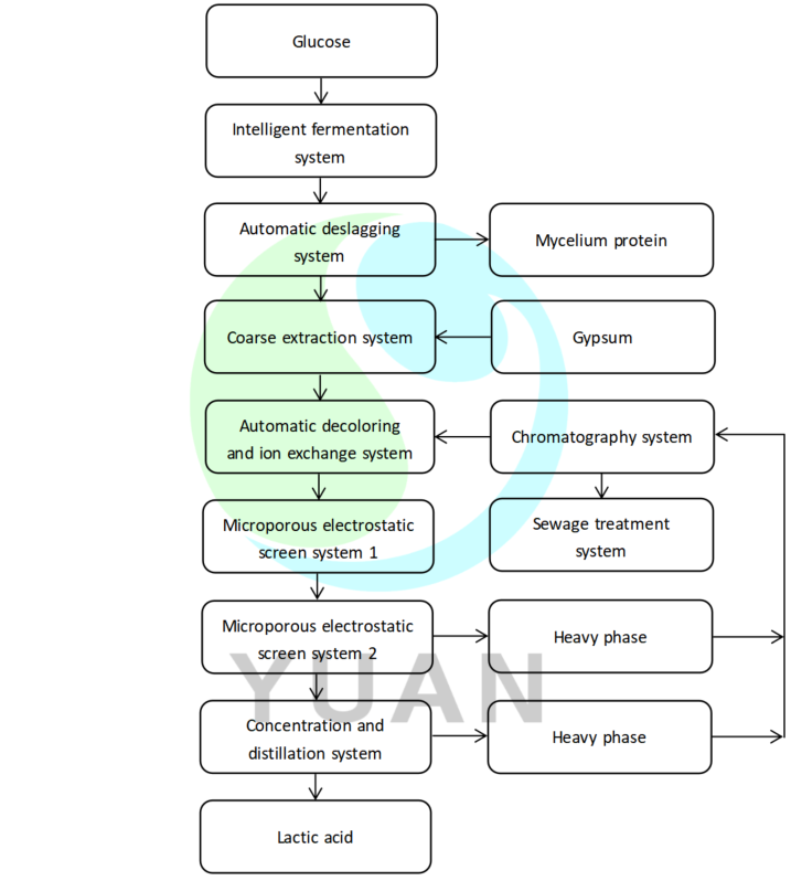 A glicose qualificada após o sistema de lotes e eliminação entra no sistema de fermentação para manter um certo tempo de fermentação e depois entra no sistema de remoção de filtração para remover a proteína grossa. Depois que o caldo de fermentação está concentrado, ele entra no sistema de acidólise de lactato de cálcio. Após a filtragem do Caso4, ele passa pelo sistema de isolamento contínuo para descoloração, desodorização e dessalinização. Após o refino, ele entra no sistema de filtração da membrana, sistema de concentração e purificação para obter o produto de ácido L-lático qualificado.