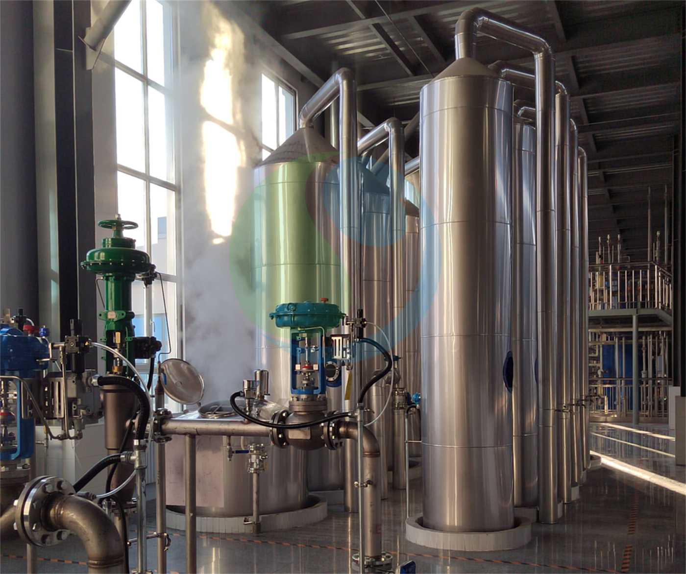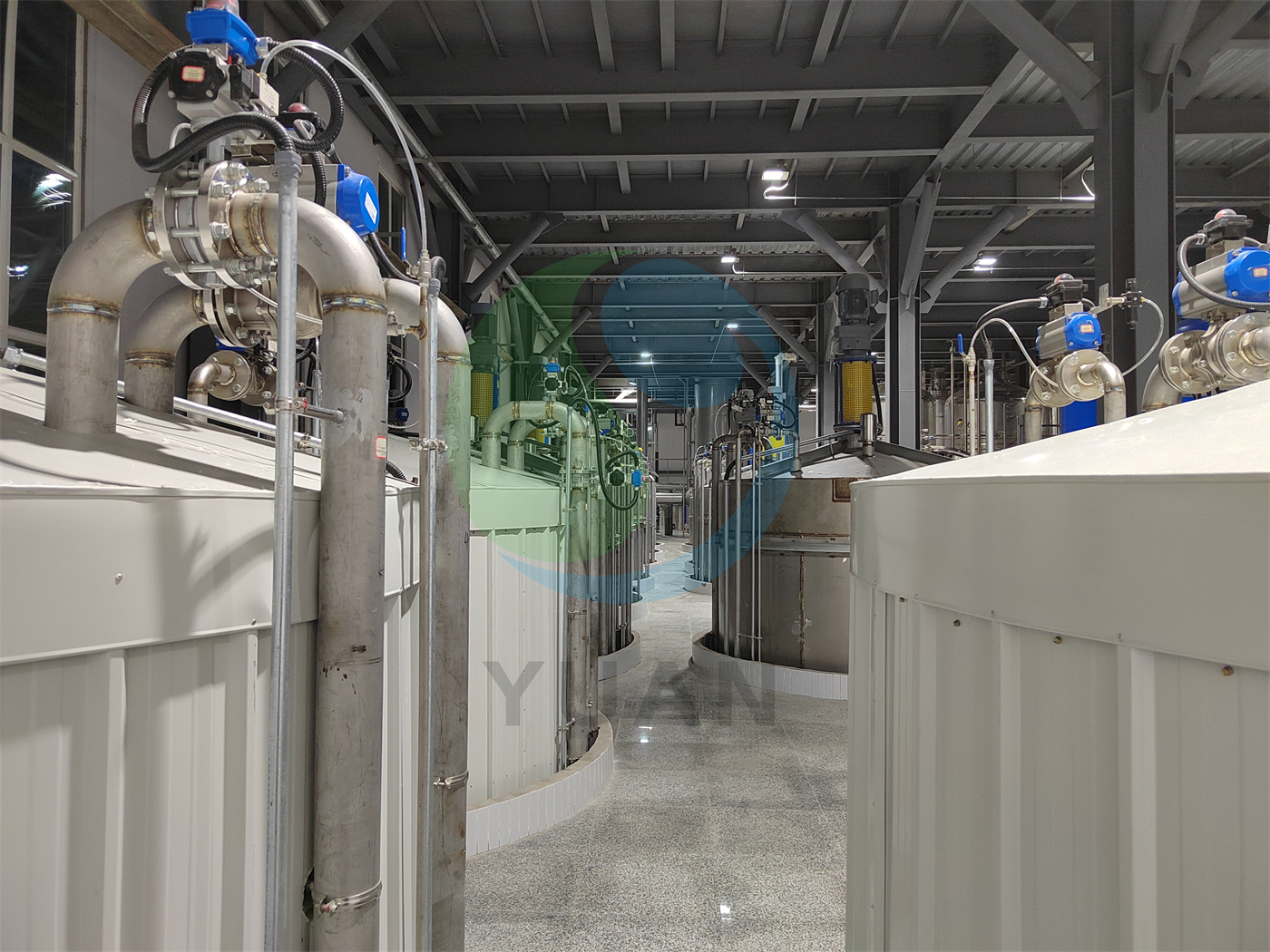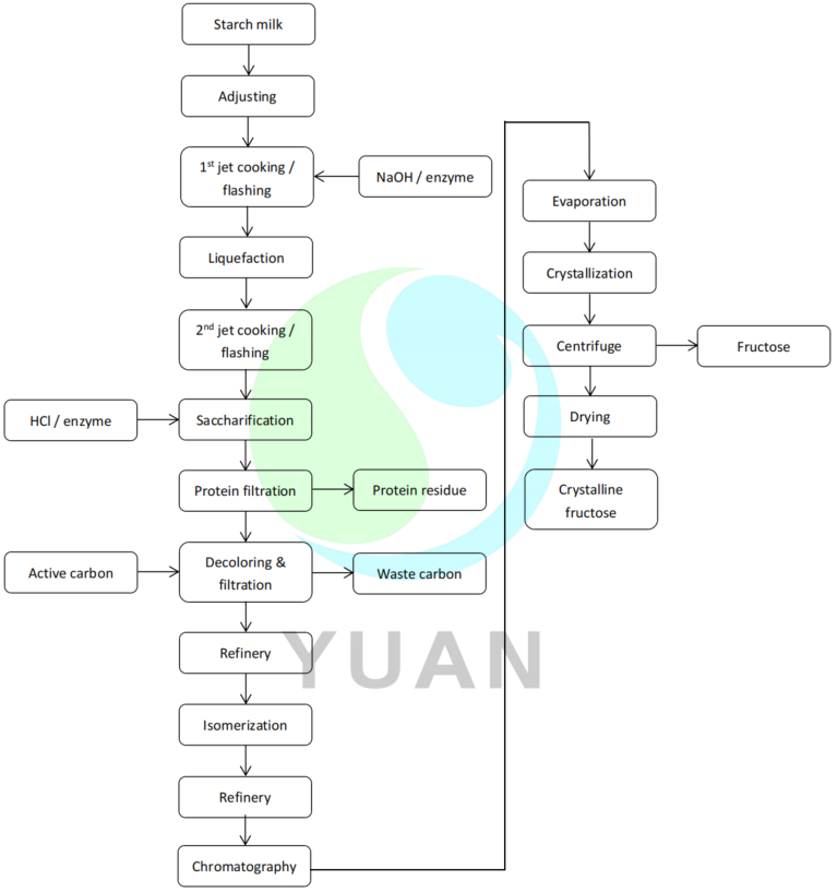 O amido comercial é enviado ao tanque de dissolução e dissolvido adicionando água. Em seguida, entra no tanque de mistura de pasta, através de detecção e controle on -line, ajuste o DS, o valor do pH e a quantidade de enzima do leite de amido e, em seguida, entra no sistema de liquefação automática. Adote duas vezes ejeção, piscando duas vezes, mantenha a temperatura apropriada. e um certo tempo, para garantir o melhor efeito de liquefação. Após a liquefação, através do ajuste do pH e adição de enzimas, o xarope é enviado ao sistema de sacarificação. Ao controlar a quantidade de tempo de enzima e sacarificação, o valor DE ou DX exigido pelo produto final é atingido e a glicose entra no estágio de filtração para remover a menor proteína e outras impurezas misturadas no produto. Após a filtração, a glicose líquida passa por descoloria, filtragem e sistema de troca de íons contínuos para remover as impurezas coloridas e os íons de impureza da glicose, para que a glicose possa alcançar o objetivo de refinar e purificação. Após a evaporação, a glicose entra no sistema de isomerização para obter a frutose 42%. Através da refinaria e evaporação, o F42 entra no sistema de cromatografia para obter a alta frutose. Após a evaporação, a alta frutose entra no sistema de cristalização. Então, através da separação e secagem centrífuga, o produto de frutose cristalina qualificado será obtido.