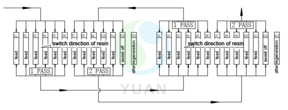 É o mesmo com um sistema de troca de íons comum. A resina em nosso equipamento é preenchida na coluna e é regenerada após o uso. Mais importante, a resina em todo o sistema é dividida em mais unidades para uma operação mais detalhada. A utilização multi -utilização do sistema está apenas dividindo o grande leito de resina fixa em muitas unidades gerenciáveis que são carregadas, respectivamente, em cada coluna de resina pequena.